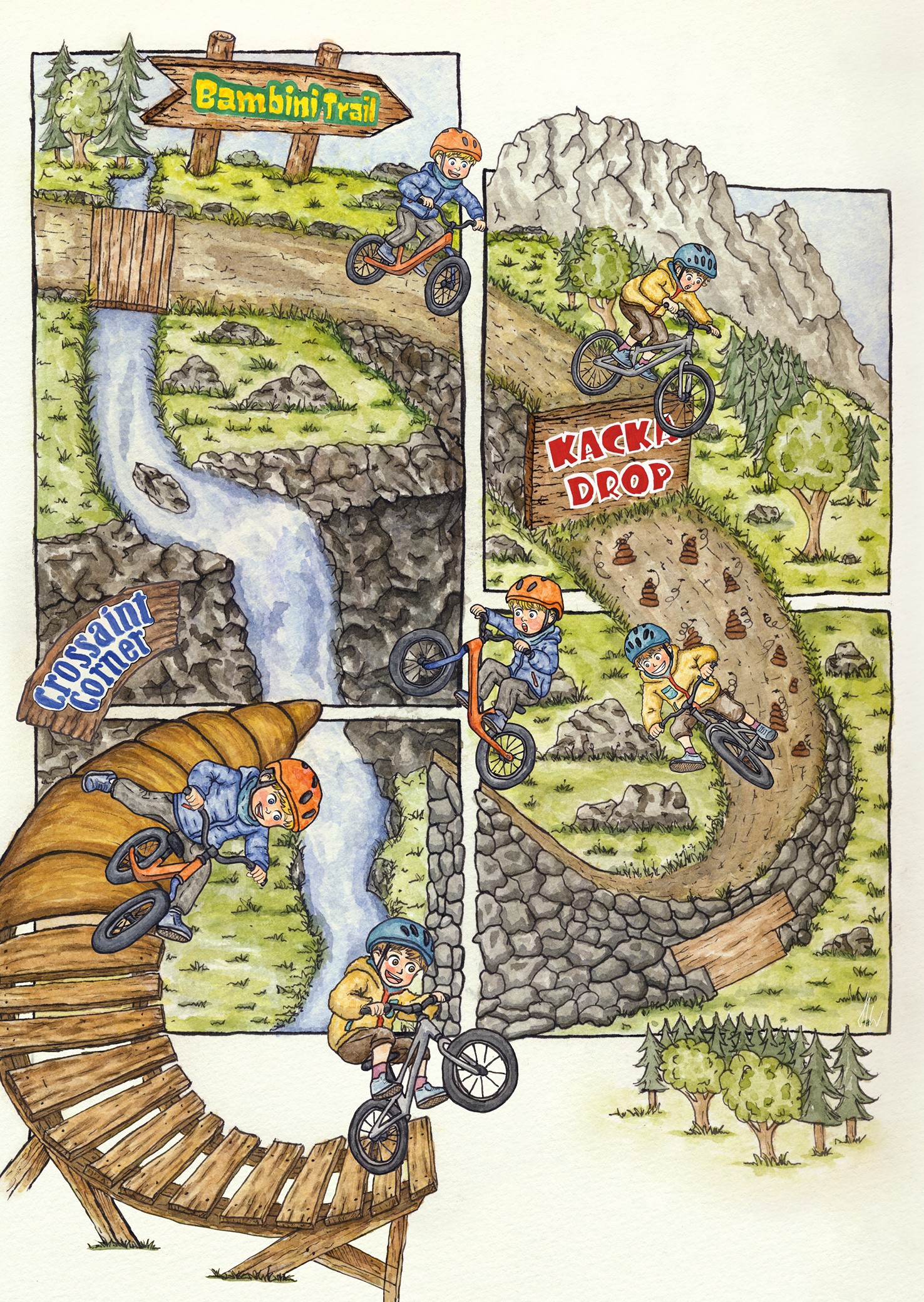 „Emil & Karl – Small Tires, Big Mountains“ follows Jakob and Konne, two adventurous fathers, on a six-day mountain bike tour through the Swiss Alps. Their two two-and-a-half-year-old „co-pilots“ Karl and Emil are always by their side. The goal is a 180-kilometer tour with 6000 meters of altitude gain around the Swiss National Park.